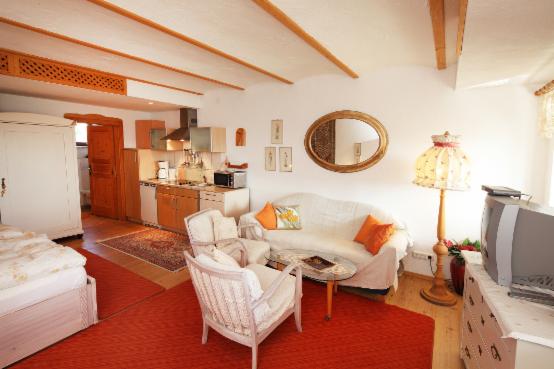 38qm mit eigener Veranda und Frühstücksplatz mit Schlafniche für Kind (Max. 140cm) und Garten. Blick Richtung Südosten über die rollenden Wiesen (naturgeschützt). 1 großes Wohn/Schlafzimmer mit Doppelbett, Einbauküche und Bad mit Dusche & WC. TV mit SAT-Anschluss und Radio.